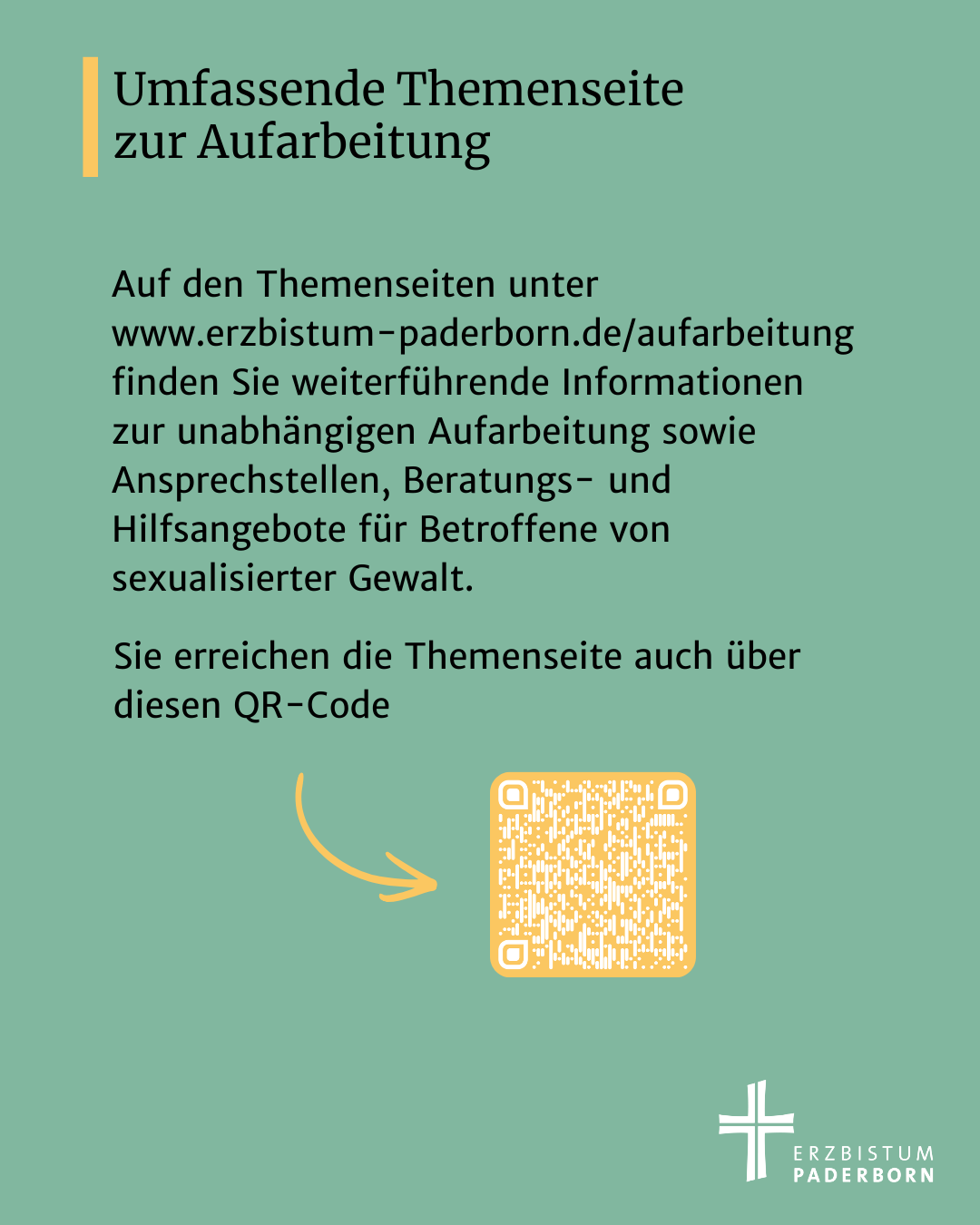 Über Hilfsangebote für Betroffene und über die Aufarbeitung im Erzbistum Paderborn informieren die Themenseiten unter www.erzbistum-paderborn.de/aufarbeitung. Die Broschüre „Informationen zum Umgang mit und zur Aufarbeitung von sexuellem Missbrauch im Erzbistum Paderborn“ kann ergänzend im Shop des Erzbistums bestellt werden (https://shop.erzbistum-paderborn.de/).