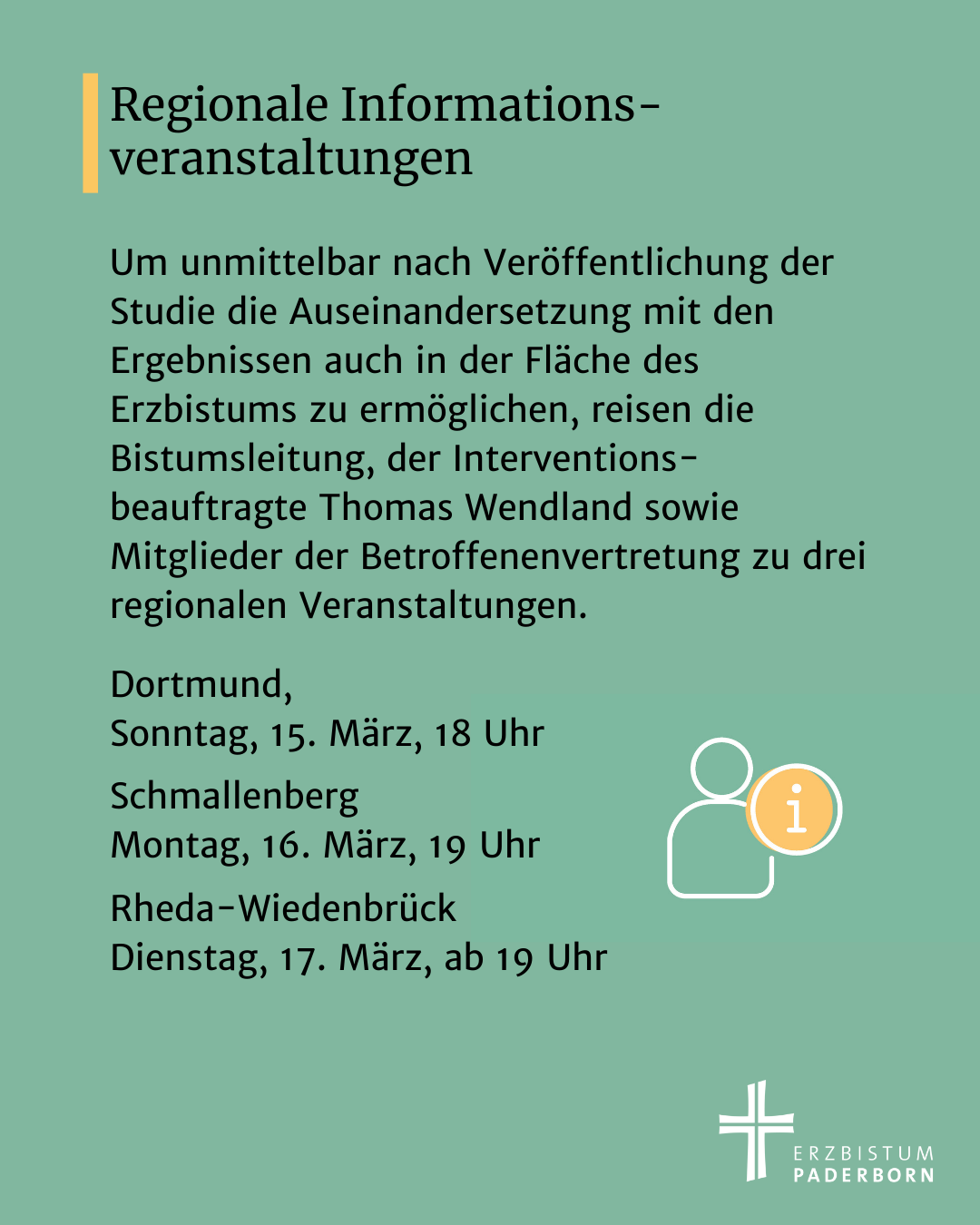 Bei Regionalveranstaltungen in Dortmund, Schmallenberg und Rheda-Wiedenbrück geht die Bistumsleitung vom 15.-17. März 2026 gemeinsam mit der Betroffenenvertretung und dem Interventionsbeauftragten Thomas Wendland mit allen Interessierten in Austausch über die Studie. Berichte von den Veranstaltungen stehen ab dem 16. März online unter erzbistum-paderborn.de zur Verfügung und können zum Verlinken genutzt werden.