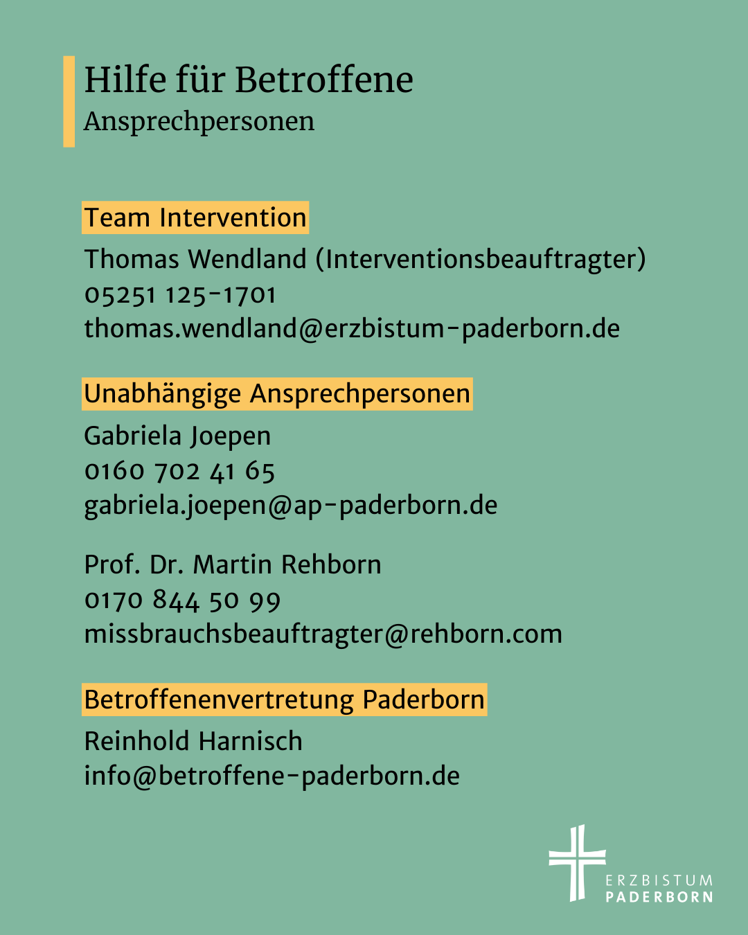 Dr. Martin Rehborn, 0170 844 50 99, missbrauchsbeauftragter@rehborn.com, Dortmund - Der Beauftragte für den Missbrauch geistlicher Autorität steht für Anfragen zur Verfügung: 05251 125-1289, fromme@erzbistum-paderborn.de.