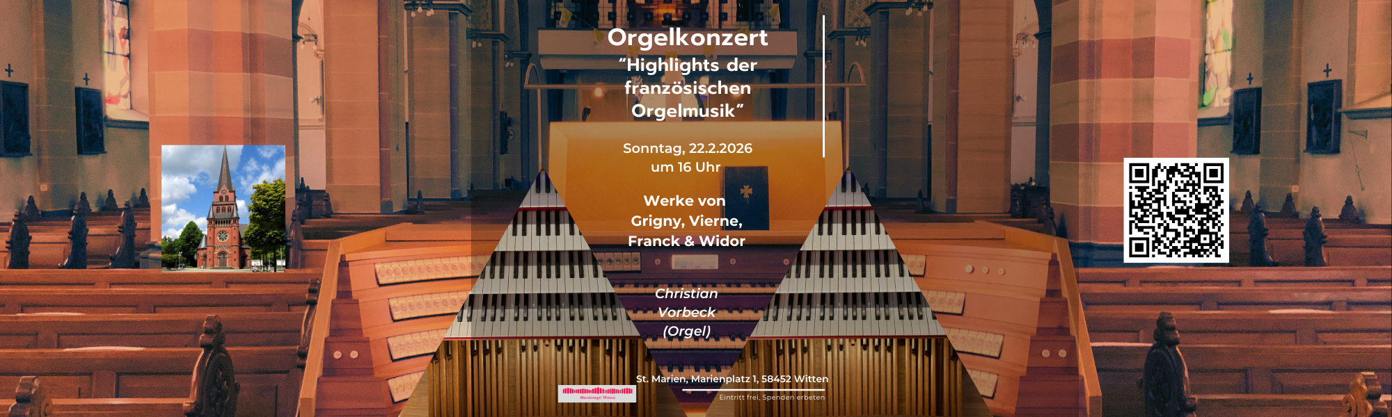 Am Sonntag, den 22. Februar 2026 findet um 16 Uhr in der Marienkirche zu Witten wieder ein besonderes Orgelkonzert statt: Unter dem Motto „Highlights der französischen Orgelmusik“ wird Kantor Christian Vorbeck an der großen Marienorgel ein abwechslungsreiches musikalisches Programm darbieten. Es erklingen Orgelwerke von Nicolas de Grigny, Louis Vierne, Cesar Franck und Charles-Marie Widor. Unter anderem kommt auch die berühmte Toccata aus Widors 5. Orgelsymphonie zur Aufführung. Dabei wird Marienkantor Christian Vorbeck am Konzertspieltisch im vorderen Kirchenschiff musizieren: So können alle Interessierte den Interpreten nicht nur hören, sondern dessen Musizieren auch aus nächster Nähe optisch mitverfolgen. Herzliche Einladung an alle, die das Orgelkonzert „Highlights der französischen Orgelmusik“ miterleben möchten! Der Eintritt ist frei, am Ausgang wird um eine Spende gebeten.